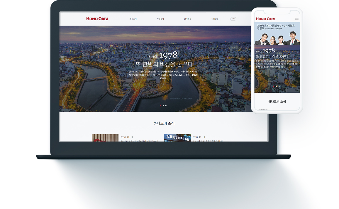 하나코비 고유컬러를 활용하여 기업 아이덴티티를 디자인에 녹여내었으며, 다양한 경영분야 및 홍보 콘텐츠를 강화하였습니다.