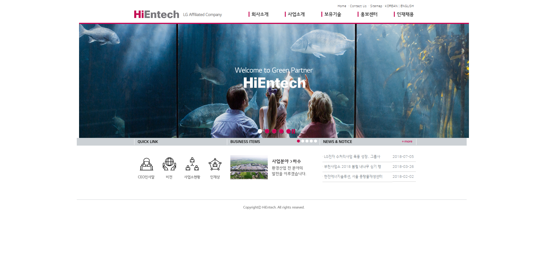 하이엔텍 웹사이트의 일부 개편을 진행하였습니다. 이번 개편에서는 기존 이미지로 되어 있어 변경이 어려웠던 메뉴부분을 재구성하여 추후 유지보수가 용이하도록 하였습니다. 또한 기업이미지를 반영할 수 있는 이미지를 메인에 슬라이드 형식으로 추가 적용하고 콘텐츠를 보완하는 쪽으로 진행이 되었습니다.
