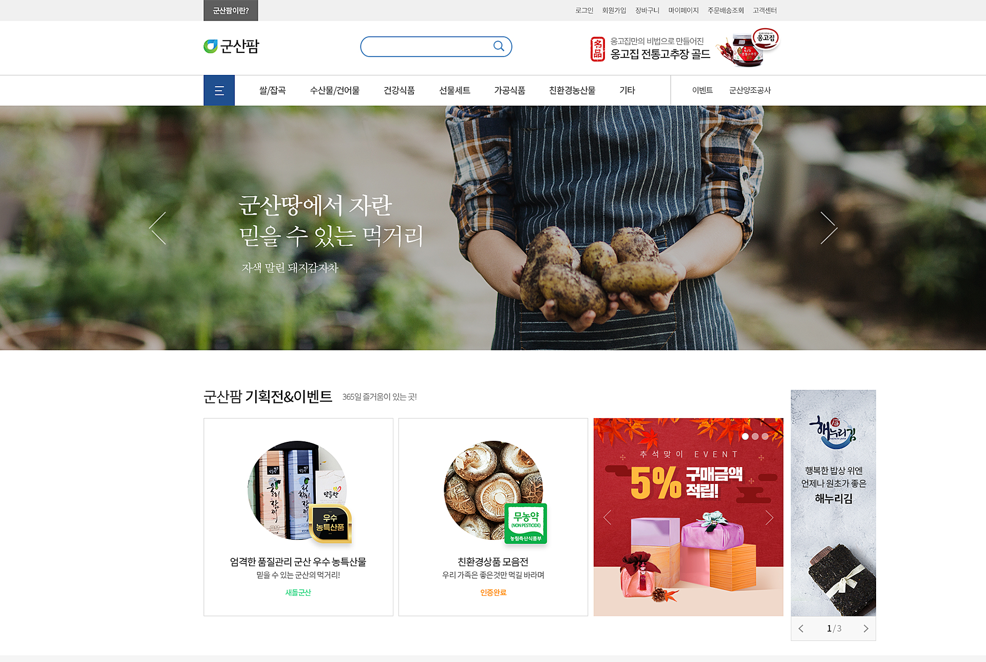 군산시 농수특산물 대표 쇼핑몰, 군산팜 비영리 쇼핑몰인 군산팜 쇼핑몰을 구축하였습니다.
