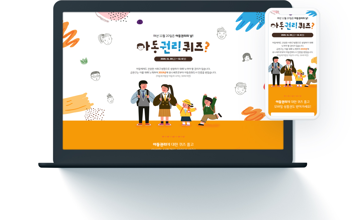 매년 11월 20일은 아동권리의 날입니다. 금천구는 아동권리의 날을 맞이하여 아동권리퀴즈 이벤트를 진행하였습니다. 일러스트를 활용하여 친근한 느낌을 주고 퀴즈이벤트를 통해 아동권리에 대한 인식을 가질 수 있는 프로젝트였습니다.