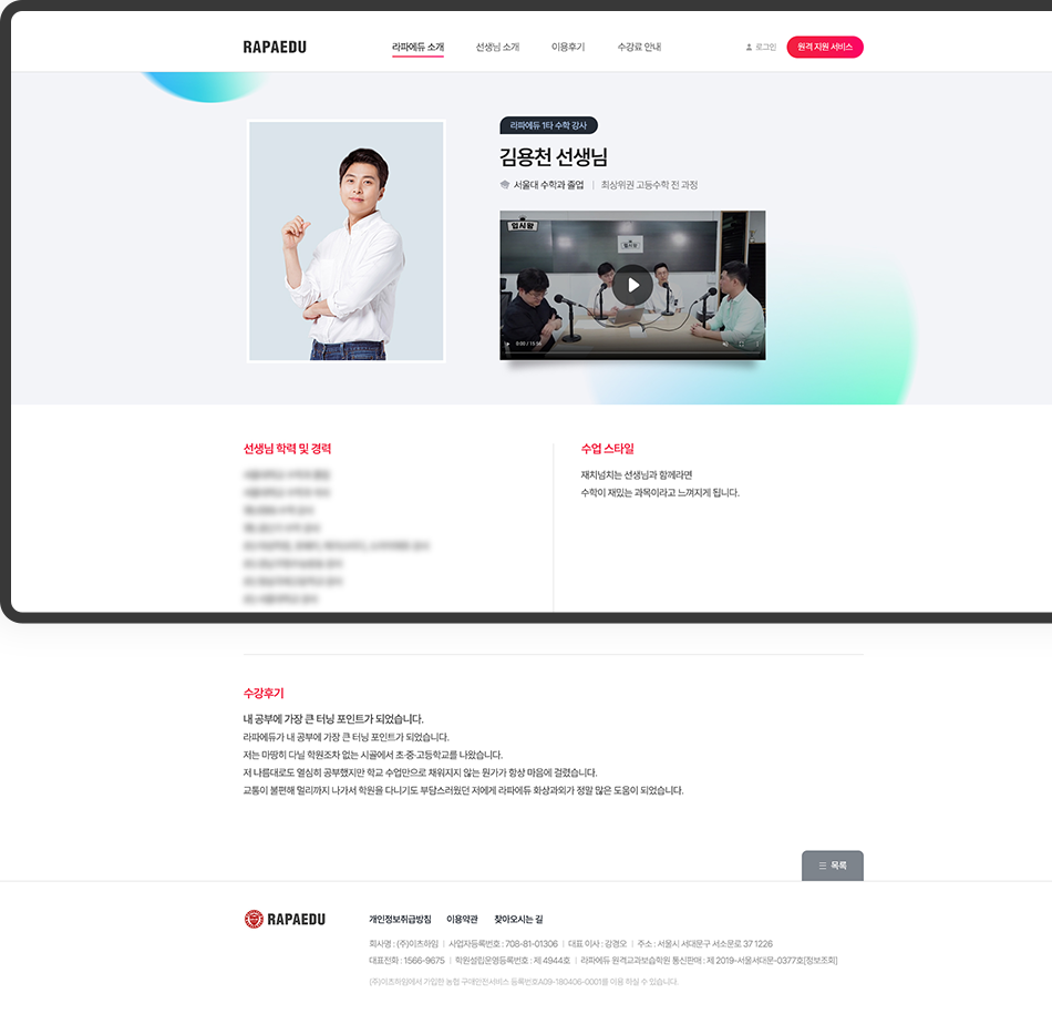 1:1과외를 전문으로 하고 있는 라파에듀에서 강사소개를 위한 사이트를 제작하였습니다.