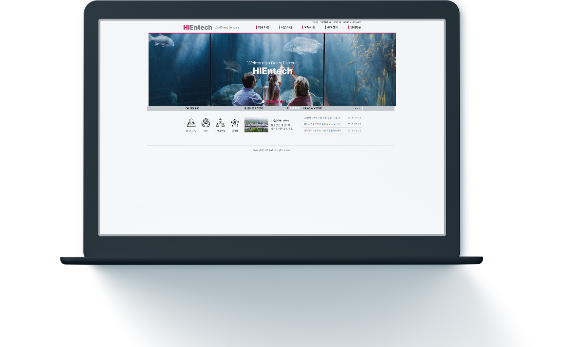 하이엔텍 웹사이트의 일부 개편을 진행하였습니다. 이번 개편에서는 기존 이미지로 되어 있어 변경이 어려웠던 메뉴부분을 재구성하여 추후 유지보수가 용이하도록 하였습니다. 또한 기업이미지를 반영할 수 있는 이미지를 메인에 슬라이드 형식으로 추가 적용하고 콘텐츠를 보완하는 쪽으로 진행이 되었습니다.