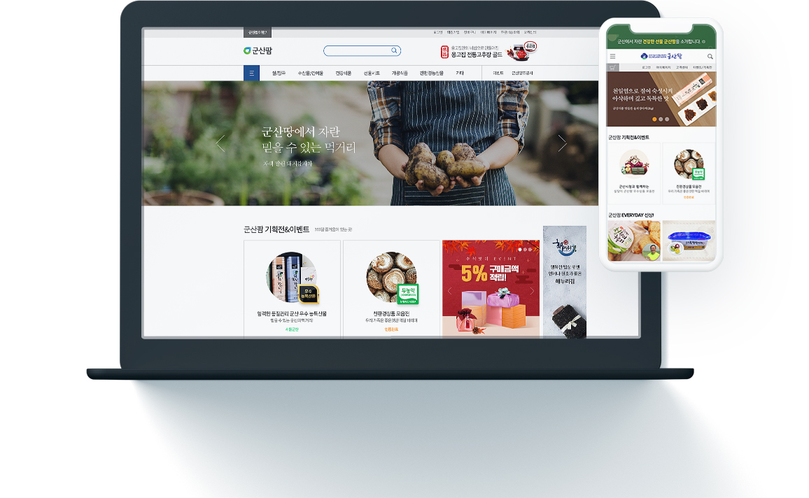 군산시 농수특산물 대표 쇼핑몰, 군산팜 비영리 쇼핑몰인 군산팜 쇼핑몰을 구축하였습니다.