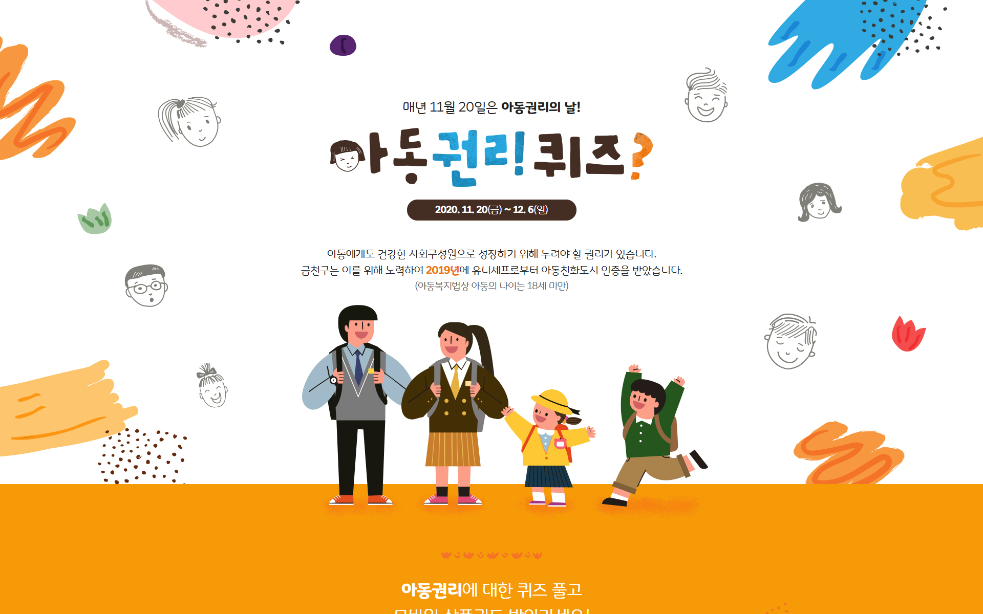 매년 11월 20일은 아동권리의 날입니다. 금천구는 아동권리의 날을 맞이하여 아동권리퀴즈 이벤트를 진행하였습니다. 일러스트를 활용하여 친근한 느낌을 주고 퀴즈이벤트를 통해 아동권리에 대한 인식을 가질 수 있는 프로젝트였습니다.